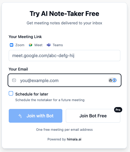 Drop your Zoom, Google Meet or Teams link and get clear notes, action items, and key decisions sent to your inbox for free.